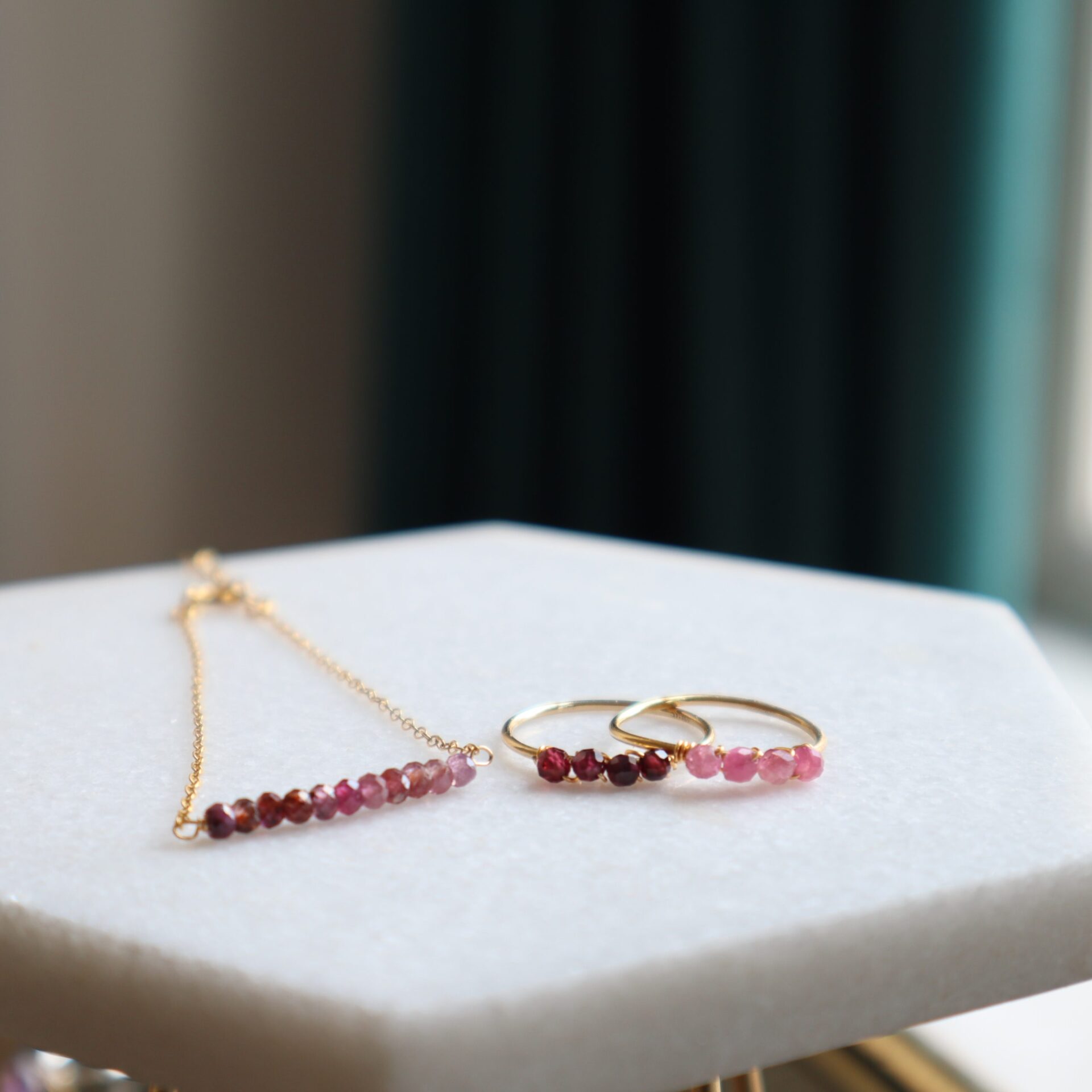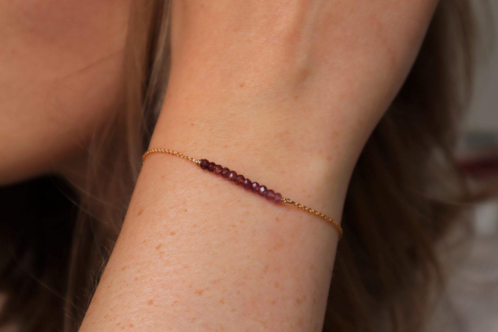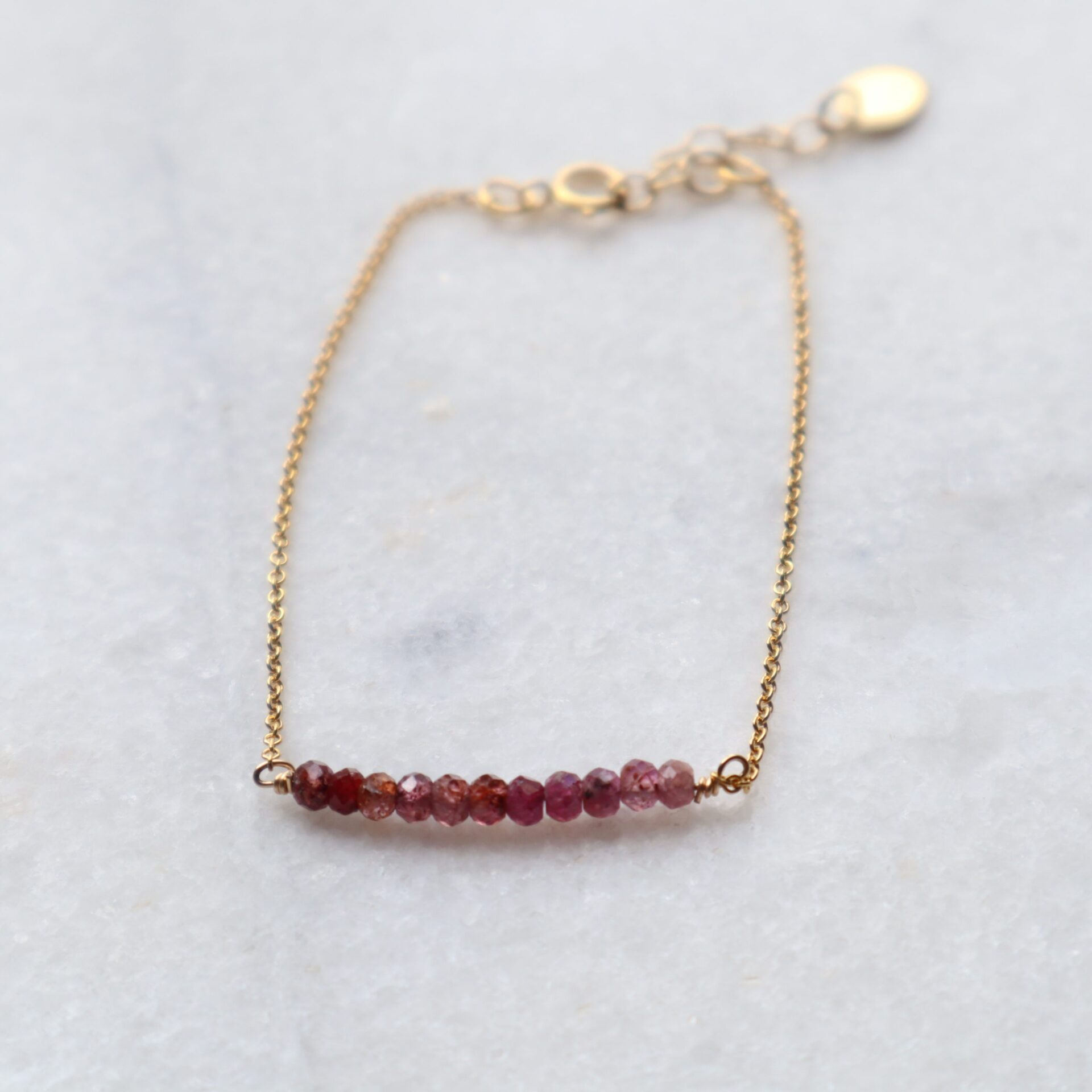 Deze met geslepen robijn schittert als geen ander. De robijntjes hebben verschillende kleuren, van lichtroze tot donkerrood. Elk kraaltje is anders, daarom is ook elke armband uniek! Ik zorg er telkens voor dat je een mooi kleurverloop hebt. De robijnen schitteren als geen ander: een echte eye catcher dus!